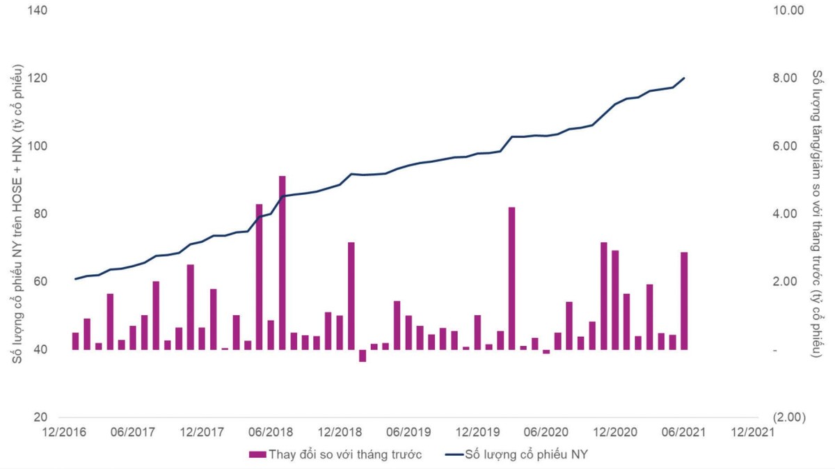 Tính đến cuối tháng 6/2021, trên HOSE, đã có 105,32 tỷ cổ phiếu được niêm yết, tăng 1,68 tỷ cổ phiếu so với thời điểm cuối tháng 5, bao gồm 0,358 tỷ cổ phiếu niêm yết lần đầu và 1,324 tỷ cổ phiếu niêm yết bổ sung (phần lớn là chia cổ phiếu thưởng).