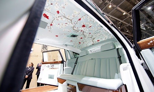 Họa tiết bên trong chiếc Rolls-Royce Phantom Serenity được trang trí hoàn toàn bằng phương pháp thủ công. Nội thất chiếc xe được làm từ gỗ anh đào, tre và khảm vỏ trai. Đồng hồ trong xe được đính nhiều viên hồng ngọc. Khi chiếc xe này được mang ra triển lãm tại Hội chợ Ôtô Geneva 2015, nó đã được mua với giá 1,5 triệu USD. Ảnh: Bloomberg