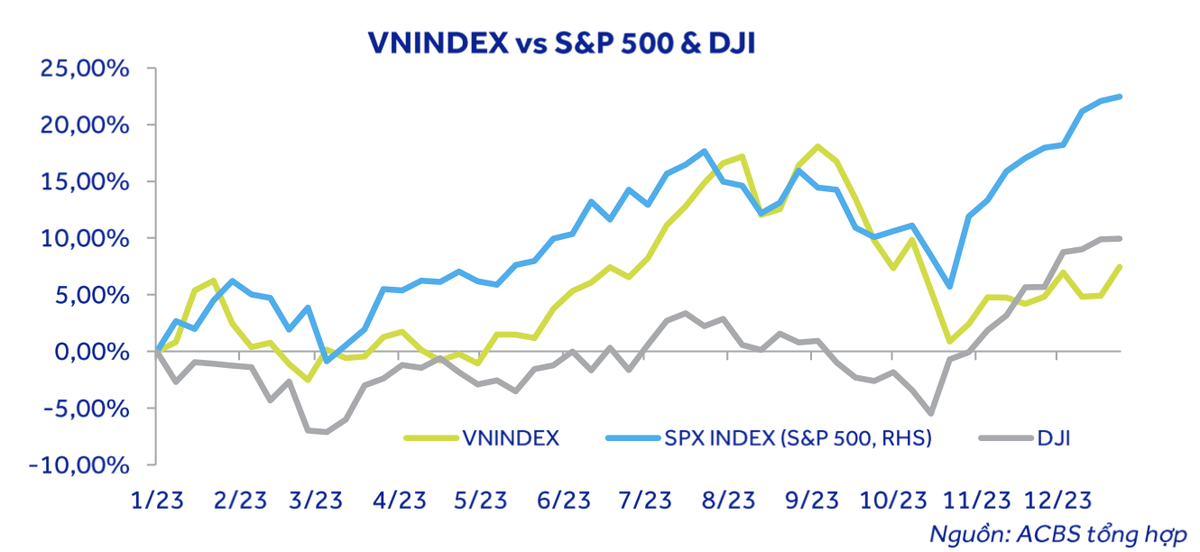 Tuy nhiên, ACBS lưu ý diễn biến của VN-Index tương đối đồng pha với diễn biến của thị trường chứng khoán Mỹ. Lý do chính là nền kinh tế của Việt Nam là một nền kinh tế mở, với tỷ trọng kim ngạch xuất nhập khẩu/GDP khoảng 160%. Trong đó, thị trường Mỹ là thị trường xuất khẩu lớn nhất của Việt Nam, dù tỷ trọng này đang giảm đi trong năm 2023.