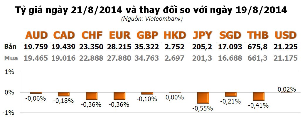 Các ngoại tệ khác đồng loạt giảm. Trong đó, giảm mạnh nhất là JPY với -0,55%; tiếp đến là EUR và CHF cùng -0,36%; THB với -0,41...
