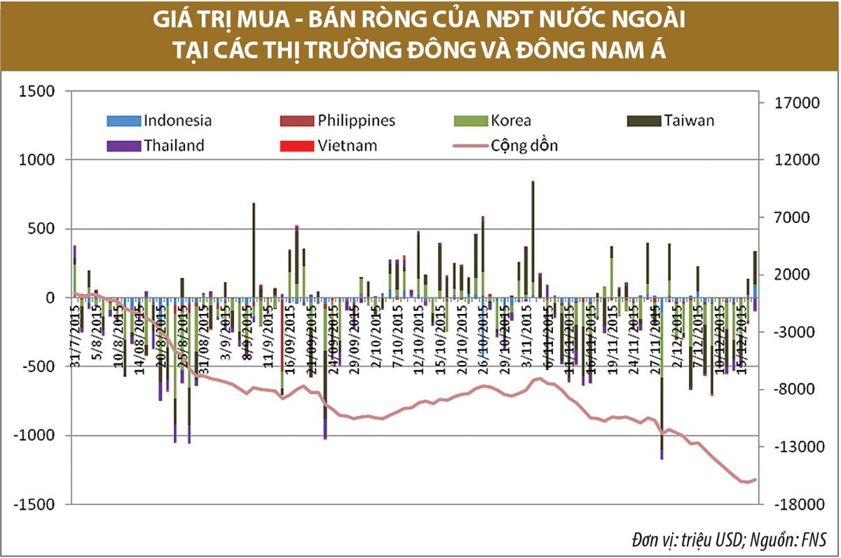 Tại một số nước vùng Đông và Đông Nam Á, giá trị bán ròng của NĐT nước ngoài đều tăng cao trước khi diễn ra phiên họp của Fed vào tháng 9 và tháng 12. Sau phiên họp tháng 9, NĐT nước ngoài có xu hướng mua ròng trở lại, nhưng giá trị không lớn. Phiên họp tháng 12 mới kết thúc và NĐT nước ngoài cũng đã quay lại mua ròng. Điều này tạo ra hy vọng NĐT nước ngoài sẽ tiếp tục mua ròng và thúc đẩy thị trường các nước.