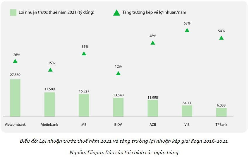 Đà tăng trưởng bền vững là điểm nổi bật của các doanh nghiệp trong danh sách Top 50 của Forbes. Trong 5 năm qua (2016 - 2021), tổng lợi nhuận trước thuế của Top 7 ngân hàng này đã tăng gấp 3 lần, từ 30 nghìn tỷ đồng lên 100 nghìn tỷ đồng. Vietcombank liên tục dẫn đầu về quy mô lợi nhuận trong nhiều năm, trong khi VIB dẫn đầu về tốc độ tăng trưởng lợi nhuận với mức tăng trưởng kép đạt 63%/năm trong 5 năm liền.
