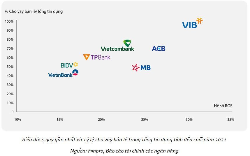 ROE (tỷ suất sinh lời trên vốn chủ sở hữu) trung bình của Top 7 nhà băng này đang ở mức 20%, cao hơn gấp đôi so với mức trung bình 8%-10% của các ngân hàng trong khu vực. Trong đó, VIB hiện dẫn đầu toàn ngành với ROE 30% cùng danh mục cho vay bán lẻ đạt gần 90%, theo sau là ACB.