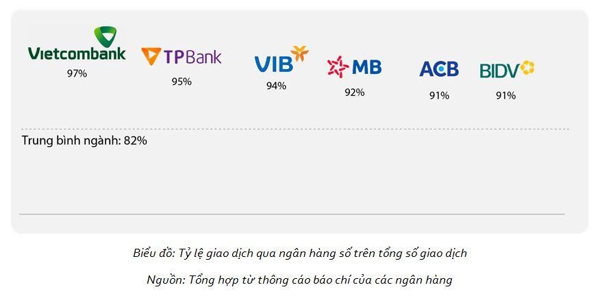 6 trong số 7 ngân hàng niêm yết tiêu biểu đã đầu tư mạnh mẽ vào công cuộc chuyển đổi số trong nhiều năm và nằm trong top dẫn đầu, với tỷ lệ giao dịch qua ngân hàng số chiếm đến trên 90% trên tổng số giao dịch.