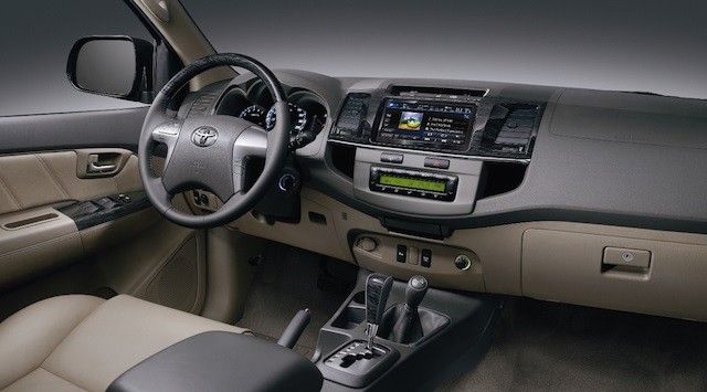 Fortuner TRD Sportivo 2015 V được trang bị tay lái bọc da, ốp gỗ, tích hợp nút điều chỉnh hệ thống âm thanh và màn hình đa thông tin. Bảng đồng hồ của xe cũng được thiết phù hợp, giúp người lái có thể dễ dàng quan sát và nắm bắt tình trạng vận hành của xe. Fortuner được trang bị cửa sổ chỉnh điện với chức năng lên/xuống 1 chạm và chống kẹt phía người lái, giúp việc điều khiển trở nên thật thuận tiện. Xe được trang bị dàn âm thanh 6 loa; đầu đọc phía trước là loại CD 1 đĩa có kết nối Bluetooth cho phiên bản V (4x2) và DVD cho phiên bản V (4x4) có thể kết nối với các thiết bị giải trí cầm tay thông qua cổng USB/AUX và bluetooth.