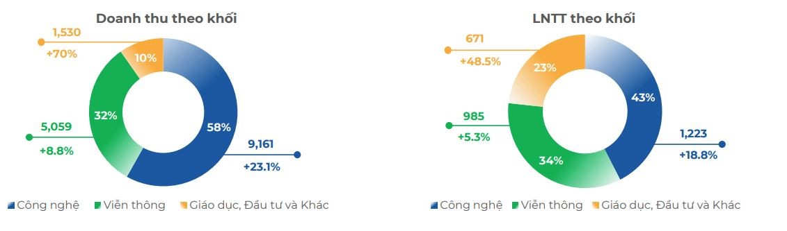 Ấn tượng nhất trong bức tranh kinh doanh của FPT là mảng giáo dục, đầu tư và khác đạt doanh thu 1.530 tỷ đồng, lợi nhuận trước thuế đạt 671 tỷ đồng, tăng lần lượt 70% và 48,5% so với cùng kỳ.