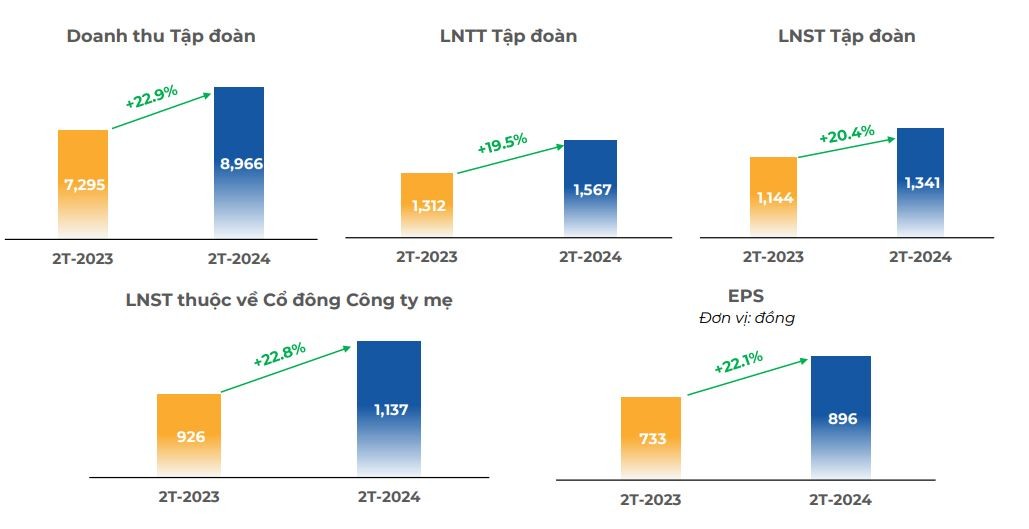 Lợi nhuận sau thuế cho cổ đông công ty mẹ và EPS lần lượt đạt 1,137 tỷ đồng và 896 đồng/cổ phiếu, tăng 22,8% và 22,1%.