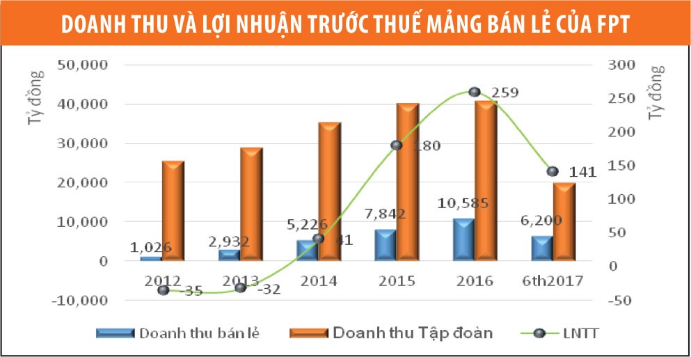 Mới nhất, trong nửa đầu năm 2017, mảng bán lẻ của FPT Retail đạt doanh thu 6.200 tỷ đồng, lợi nhuận trước thuế 141 tỷ đồng, tăng trưởng lần lượt 31% và 44% so với cùng kỳ 2015, biên lợi nhuận trước thuế đạt 2,27%, tăng nhẹ so với 2016.