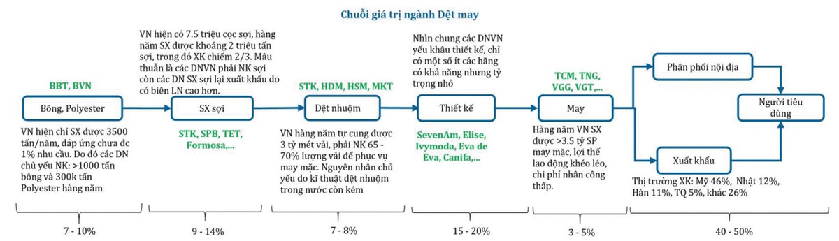 Đối với ngành dệt may, nhiều doanh nghiệp đang tích cực tham gia vào chuỗi cung ứng ở các khâu dệt nhuộm và thiết kế, đơn cử là trường hợp An Phát Holdings ký kết với Tập đoàn Dầu khí (PVN) để tham gia dự án Nhà máy xơ sợi Đình Vũ (PVTex Đình Vũ). Việc một doanh nghiệp tư nhân tham gia quản lý và vận hành dự án từng thua lỗ lớn này cho thấy tiềm năng của ngành xơ sợi tại Việt Nam, với mục tiêu đón đầu các FTA. Hay nhiều doanh nghiệp thời trang Việt Nam như Canifa, May Thái Nguyên, May Việt Tiến… đã và đang nỗ lực chủ động ở tất cả các khâu, từ nguồn nguyên liệu đến thiết kế và phân phối sản phẩm, để nâng cao giá trị sản phẩm, tăng doanh thu...