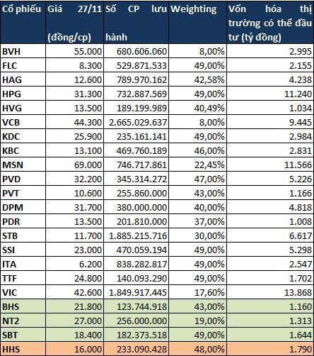 Trường hợp của HHS, giá cổ phiếu ngày 27/11 là 16.000 đồng/CP, số lượng cổ phiếu lưu hành là 233 triệu đơn vị, FTSE đã tính tỷ trọng có thể đầu tư (weighting) của HHS ở mức 48%. Do đó, vốn hóa thị trường có thể đầu tư của HHS tại thời điểm chốt dữ liệu là 1.790 tỷ đồng, đủ điều kiện của FTSE. Có thể FTSE đã tính sai vốn hoá của HHS do ngày 12/11, HHS niêm yết 122 triệu cổ phiếu bổ sung, nâng số lượng cổ phiếu lưu hành lên 233 triệu đơn vị.