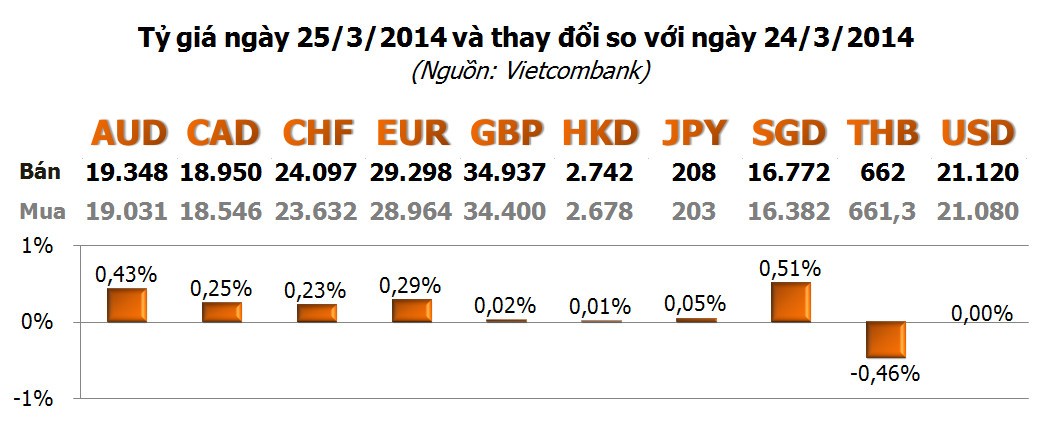 Với các ngoại tệ khác, hầu hết tăng giá. Trong đó, SGD tăng nhiều nhất với 0,51%; tiếp đến là AUD với 0,43%; EUR với 0,29%; CAD với 0,25%... Ở chiều giảm, chỉ có THB với -0,46%.