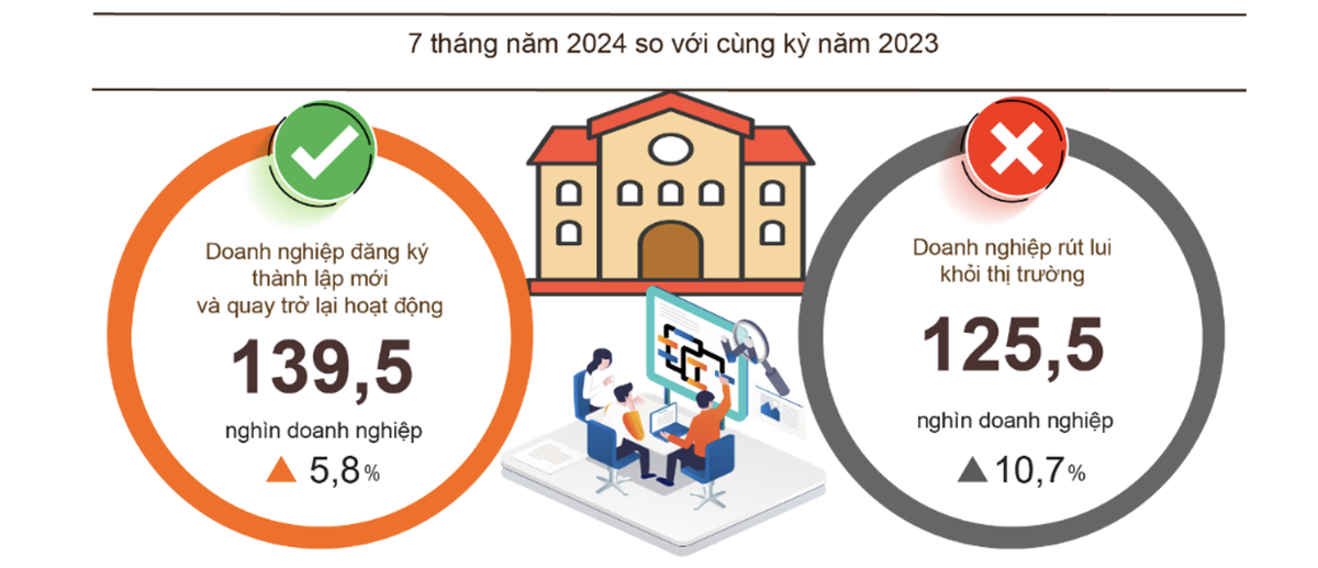 Tính chung 7 tháng năm 2024, số doanh nghiệp tạm ngừng kinh doanh có thời hạn là hơn 78.000 doanh nghiệp, tăng 16,7% so với cùng kỳ năm trước; hơn 35.500 doanh nghiệp ngừng hoạt động chờ làm thủ tục giải thể, giảm 1,5% so với cùng kỳ; và có 11.900 doanh nghiệp hoàn tất thủ tục giải thể, tăng 14,5% so với cùng kỳ.