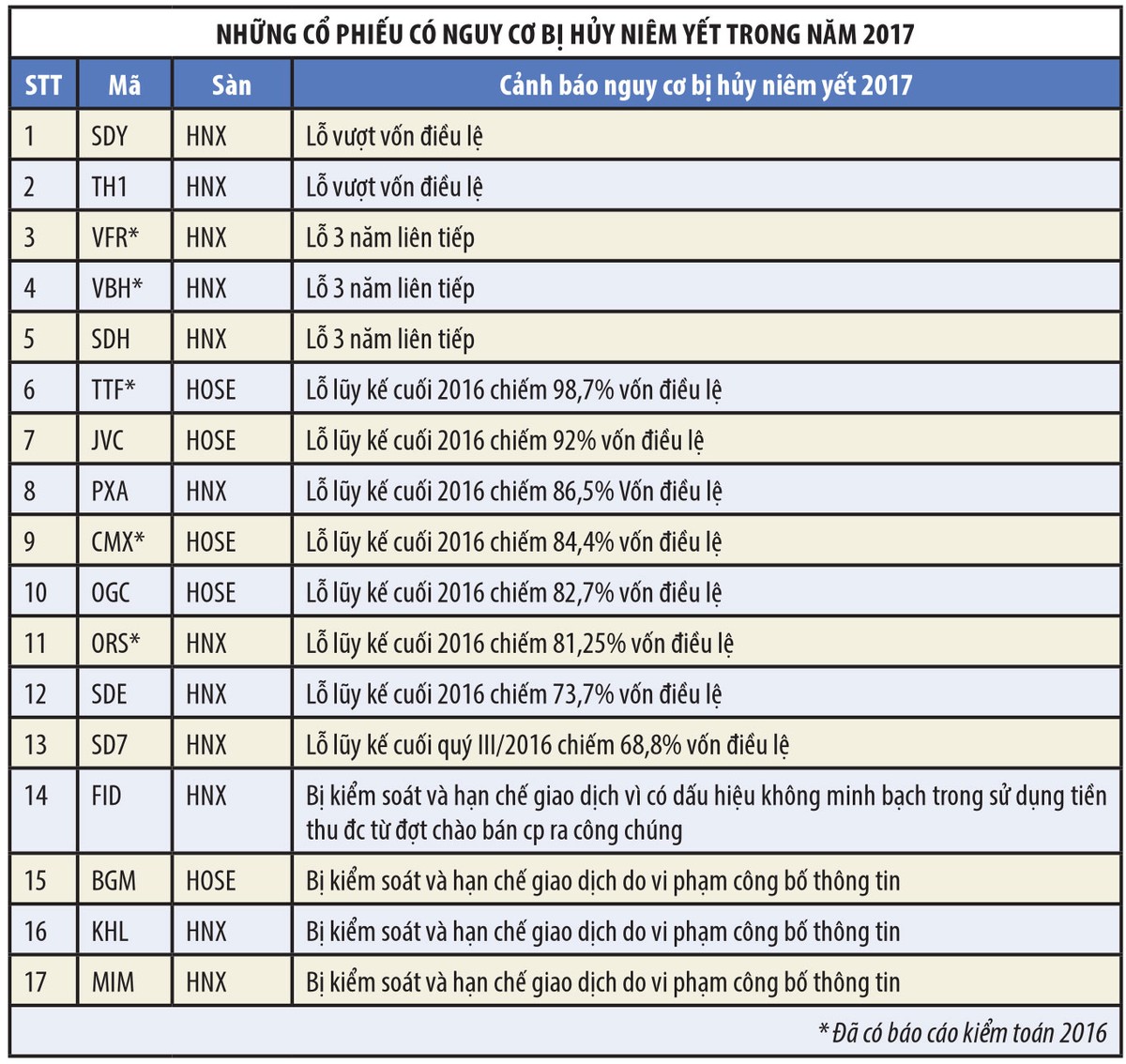 Một số công ty đứng trước nguy cơ bị hủy niêm yết là Công ty cổ phần Vận tải và Thuê tàu (VFR), Công ty cổ phần Điện tử Bình Hòa (VBH), Công ty cổ phần Xây dựng hạ tầng sông Đà (SDH), do lỗ liên tục trong 3 năm 2014 - 2016.