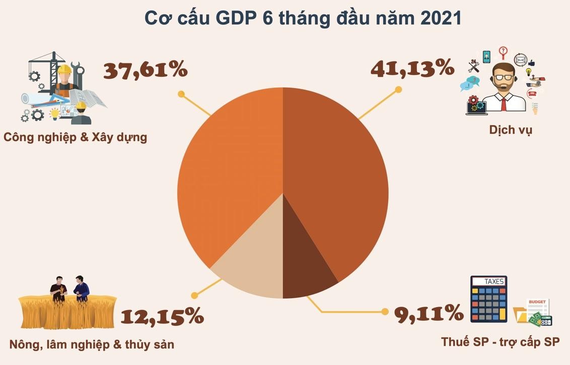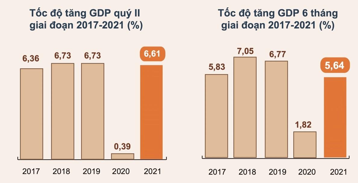 GDP 6 tháng đầu năm 2021 tăng 5,64%, cao hơn tốc độ tăng 1,82% của 6 tháng đầu năm 2020, nhưng thấp hơn tốc độ tăng 7,05% và 6,77% của cùng kỳ năm 2018 và 2019.