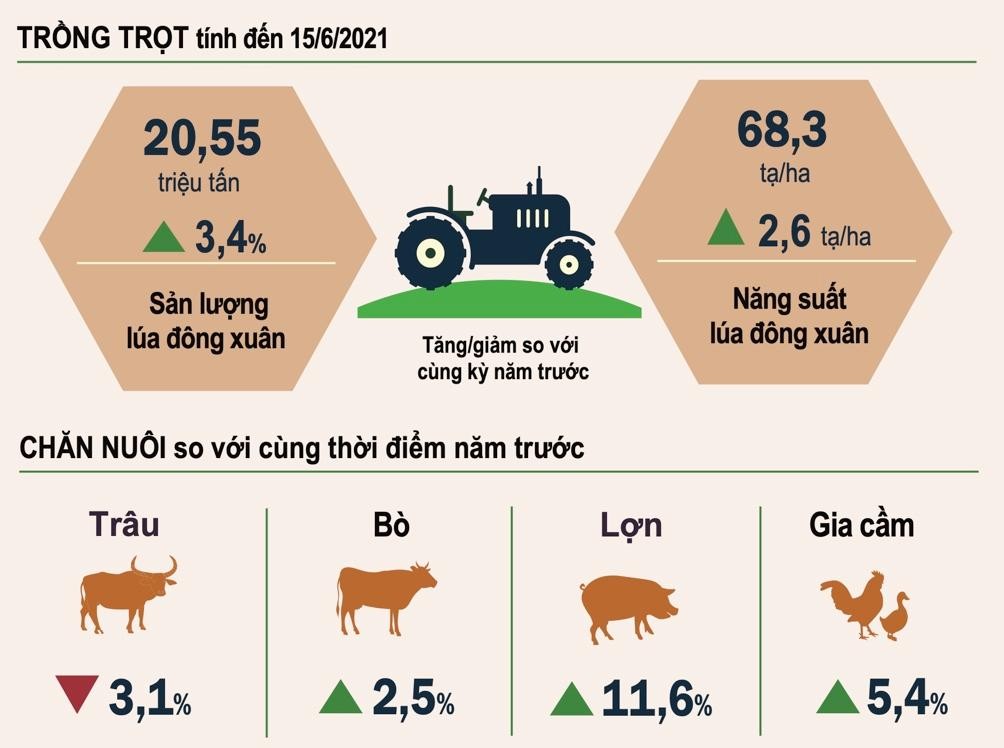 Khu vực nông, lâm nghiệp và thủy sản 6 tháng đầu năm 2021 tăng khá so với cùng kỳ năm trước do năng suất lúa đông xuân tăng cao, ngành chăn nuôi và thủy sản phát triển ổn định, các sản phẩm nông nghiệp và thủy sản chủ yếu đều tăng khá.