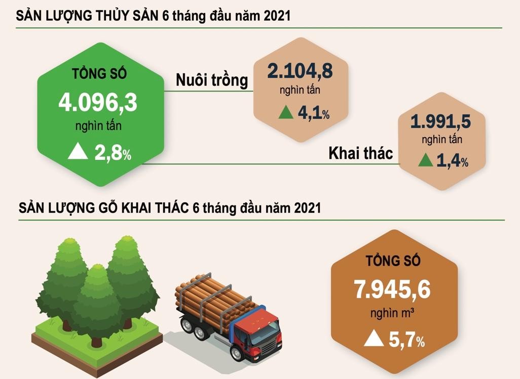 Ngành lâm nghiệp tăng 3,98% nhưng chiếm tỷ trọng thấp nên chỉ đóng góp 0,02 điểm phần trăm; ngành thủy sản tăng 4,25%, cao hơn mức tăng 2,42% của 6 tháng đầu năm 2020, đóng góp 0,11 điểm phần trăm.