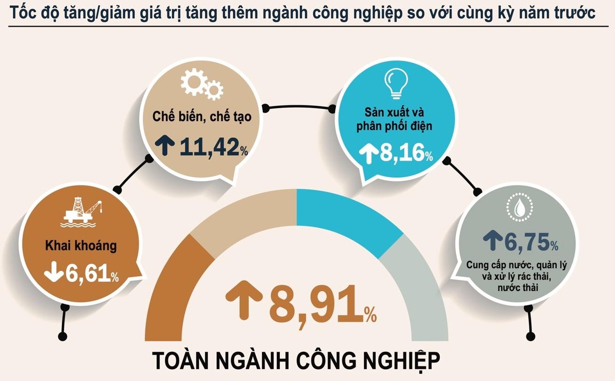 Trong khu vực công nghiệp và xây dựng, ngành công nghiệp 6 tháng đầu năm 2021 tăng 8,91% so với cùng kỳ năm trước, thấp hơn tốc độ tăng 9,13% của 6 tháng đầu năm 2019 nhưng cao hơn tốc độ tăng 2,91% của 6 tháng đầu năm 2020, đóng góp 3,01 điểm phần trăm vào tốc độ tăng tổng giá trị tăng thêm toàn nền kinh tế.