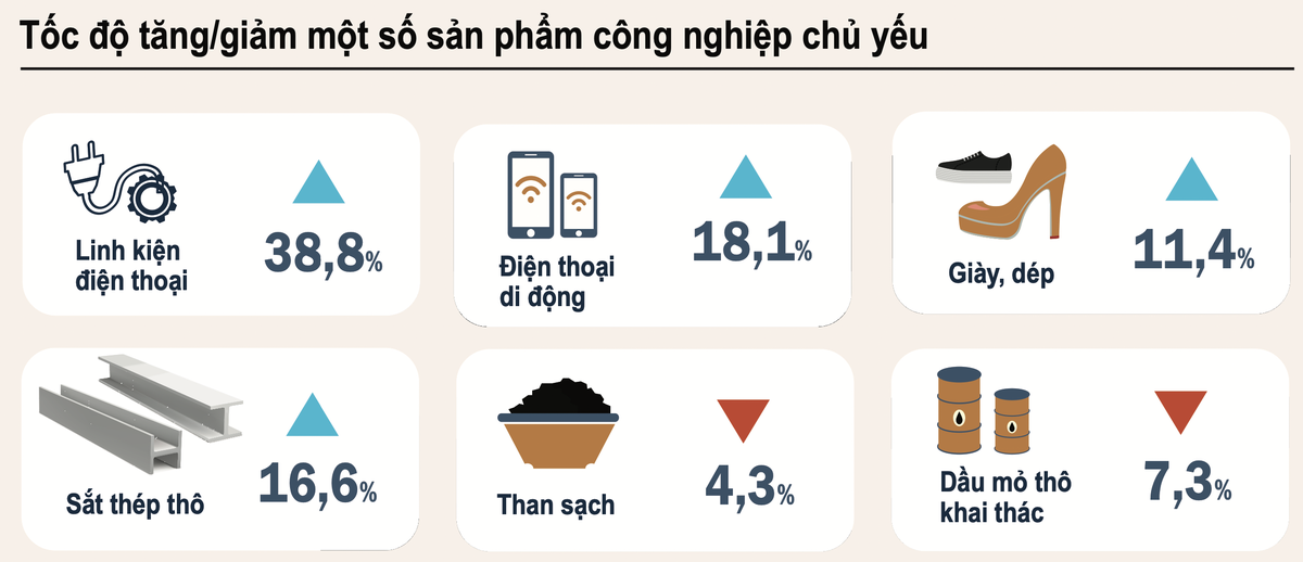 Trong mức tăng chung của toàn nền kinh tế, khu vực nông, lâm nghiệp và thủy sản tăng 3,82%, đóng góp 8,17%; khu vực công nghiệp và xây dựng tăng 8,36%, đóng góp 59,05%; khu vực dịch vụ tăng 3,96%, đóng góp 32,78%.