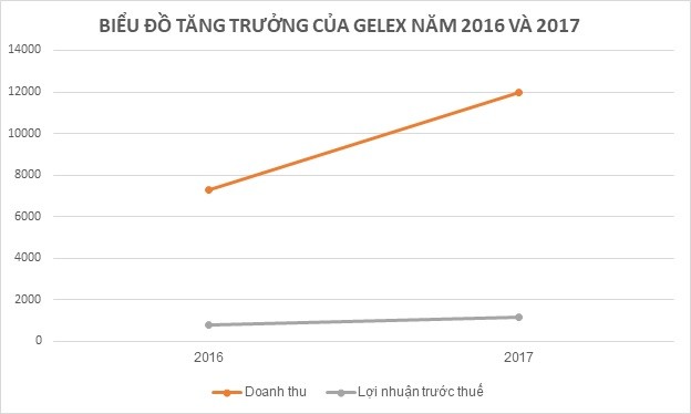Năm 2016, Gelex có doanh thu 7.297 tỷ đồng, lợi nhuận trước thuế 772 tỷ đồng. Năm 2017, doanh thu 11.984 tỷ đồng và lợi nhuận trước thuế 1.145 tỷ đồng. Tốc độ tăng trưởng năm 2017 so với năm 2016 về doanh thu và lợi nhuận trước thuế lần lượt là 64,23% và 48,35%.