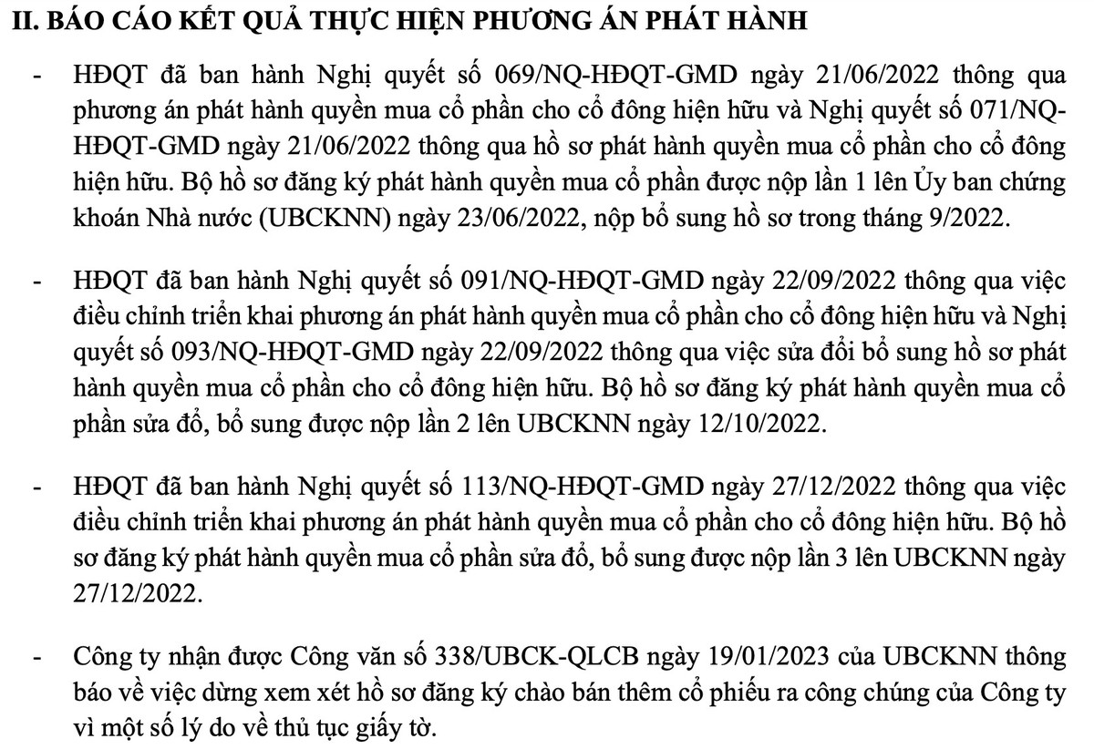 Theo đó, HĐQT đã ban hành Nghị quyết số 069/NQ-HĐQT-GMD ngày 21/06/2022 thông qua phương án phát hành quyền mua cổ phần cho cổ đông hiện hữu và Nghị quyết số 071/NQHĐQT-GMD ngày 21/06/2022 thông qua hồ sơ phát hành quyền mua cổ phần cho cổ đông hiện hữu. Bộ hồ sơ đăng ký phát hành quyền mua cổ phần được nộp lần 1 lên Ủy ban chứng khoán Nhà nước (UBCKNN) ngày 23/6/2022, nộp bổ sung hồ sơ trong tháng 9/2022.