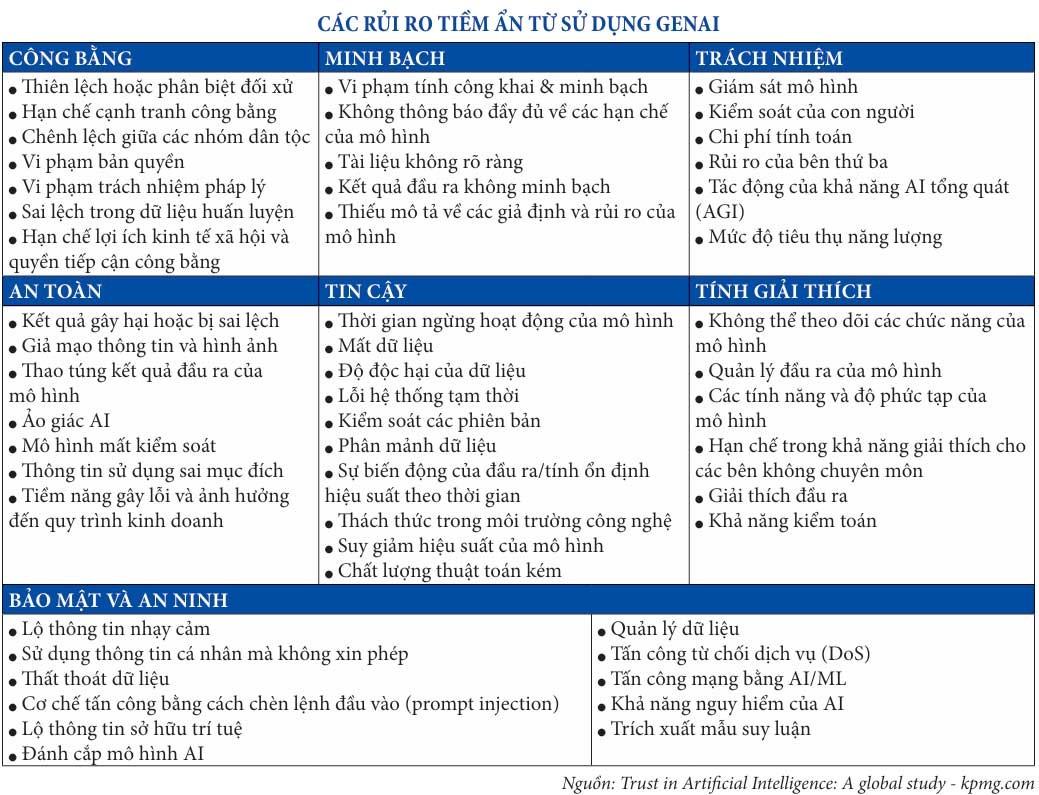 Theo khảo sát toàn cầu của KPMG về rủi ro AI/GenAI với hơn 17.000 người từ 17 quốc gia (xem hình), rủi ro an ninh mạng là mối quan tâm lớn nhất với hơn 84% số người được hỏi lựa chọn nhóm rủi ro này.