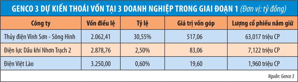 Ở giai đoạn 1, Genco 3 sẽ thoái vốn tại 3 công ty, kỳ vọng mang về 1.200 tỷ đồng, gần gấp đôi giá trị vốn góp (xem bảng). Giai đoạn 2, Tổng công ty dự kiến thoái 51% vốn điều lệ tại Công ty Nhiệt điện Mông Dương, đồng thời phát hành tăng vốn điều lệ thêm 20% cho các nhà đầu tư trong năm. Genco 3 kỳ vọng sẽ kéo tỷ lệ nợ trên vốn xuống dưới 3 lần.