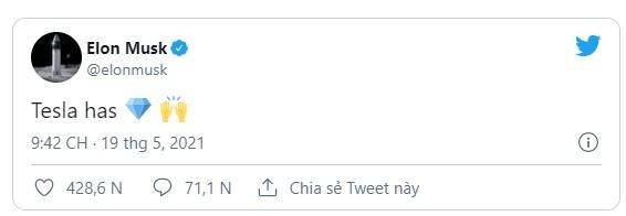 Ngay sau khi thị trường tiền điện tử bước vào giai đoạn sụt giảm mạnh, tỷ phú Elon Musk đã đăng tải những dòng tweet nhằm trấn an các nhà đầu tư. Ông đã viết Tesla cùng biểu tượng kim cương và đôi bàn tay, mang ý nghĩa đôi bàn tay kim cương, một thuật ngữ ám chỉ sẽ nắm giữ các khoản đầu tư trong dài hạn bất kể việc giảm giá đang xảy ra.