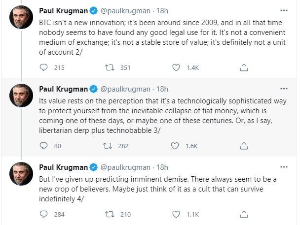 Viết trên Twitter, ông Krugman cho biết đã từ bỏ dự đoán của mình về việc Bitcoin có thể sẽ "sụp đổ ngay lập tức".