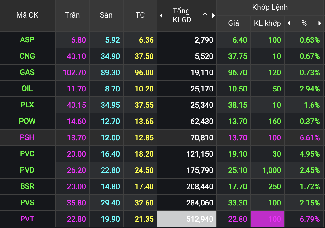Các mã khác như PVC (Tổng Công ty Hoá chất và Dịch vụ dầu khí) tăng 3,3%; OIL của Tổng Công ty dầu Việt Nam tăng 2,2%. Không thể thiếu cặp đôi PVD (Tổng CTCP Khoan và Dịch vụ Khoan Dầu khí) và PVS (Tổng CTCP Dịch vụ Kỹ thuật Dầu khí Việt Nam) cũng lần lượt tăng thêm 1,6% và 1,2%...