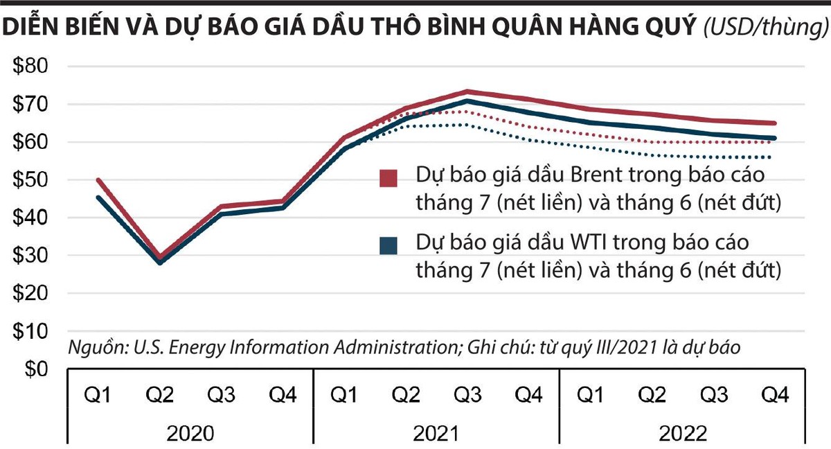 Tuy nhiên, EIA nhận định, giá dầu Brent có thể giảm dần từ tháng 9 đến tháng 12/2021, về mức 64 USD/thùng. Năm 2022, giá dầu có khả năng giảm thêm, dao động quanh mức 60 USD/thùng.