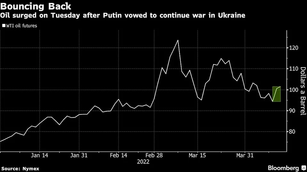 Hợp đồng tương lai dầu WTI đã tăng 0,5% ở thị trường châu Á vào sáng thứ Tư (13/4) sau khi tăng gần 7% vào thứ Ba (12/4). Ông Putin nói rằng, các cuộc đàm phán hòa bình với Ukraine đang "đi vào ngõ cụt" khi căng thẳng tiếp tục bước sang tháng thứ hai.