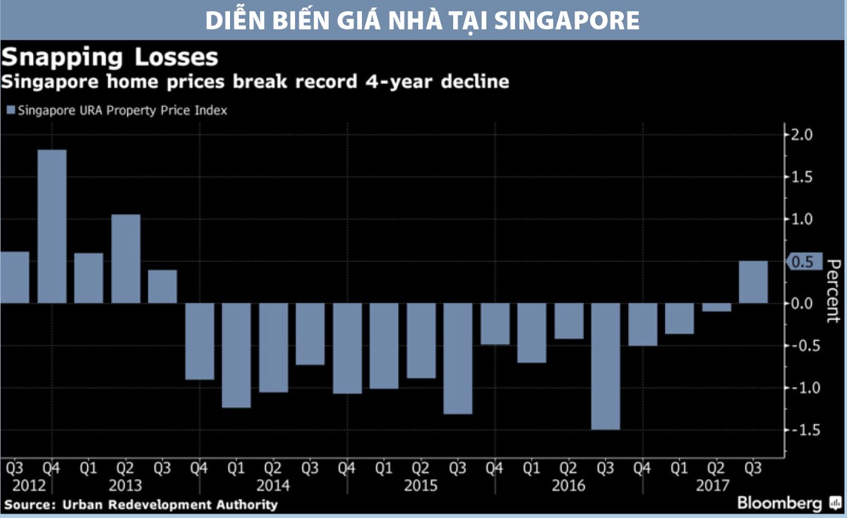 Việc giá nhà nhích nhẹ và các nhà phát triển bất động sản tích cực hơn trong hoạt động mua đất đã tạo nên kỳ vọng lạc quan rằng, thị trường bất động sản tại đảo quốc này đang hồi phục, mặc dù các biện pháp hạ nhiệt thị trường liên tiếp được ban hành kể từ năm 2009 vẫn đang còn hiệu lực. Trước khi tăng vào quý III/2017, giá nhà tại đây đã giảm 15 quý liên tiếp, lập kỷ lục chuỗi giảm dài nhất kể từ khi chỉ số này được công bố vào năm 1975.