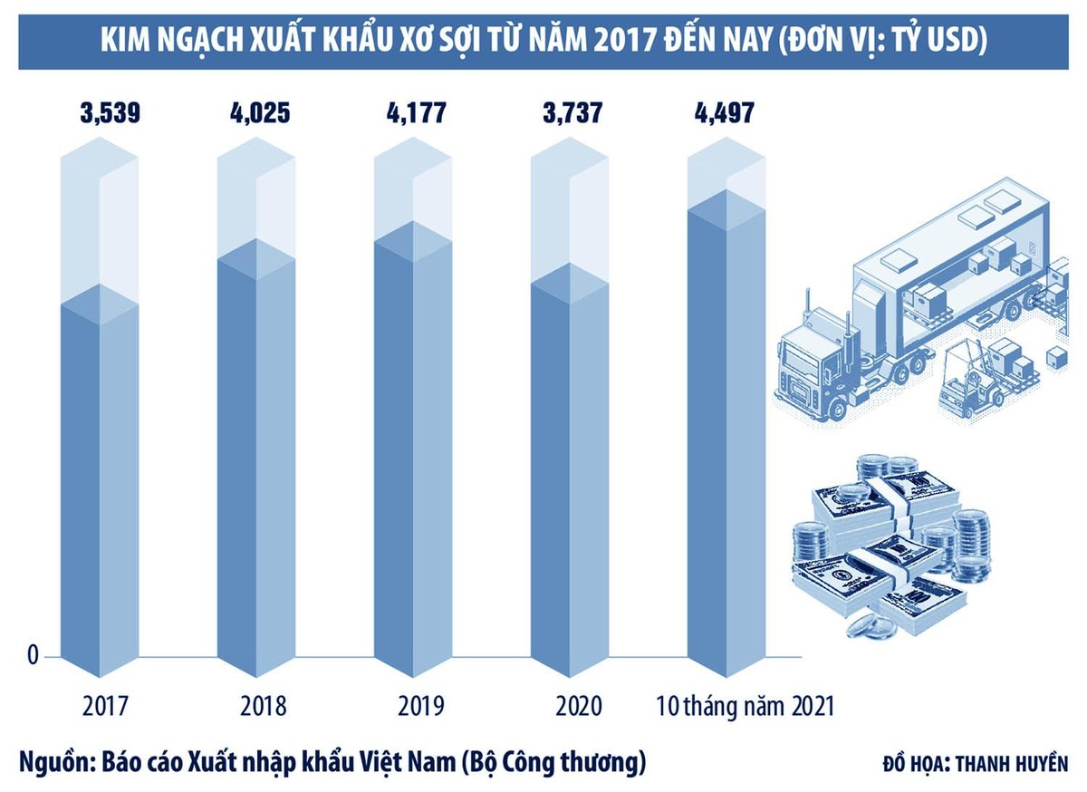 Dưới tác động của Covid-19, năm 2020, xuất khẩu dệt may đã không thể về đích với mục tiêu 39 tỷ USD, mà chỉ dừng ở 35,5 tỷ USD. Trong đó, ngoài dệt may giảm 9,2% kim ngạch xuất khẩu so với năm 2019, xơ sợi cũng giảm 10,5%, đạt 3,737 tỷ USD.