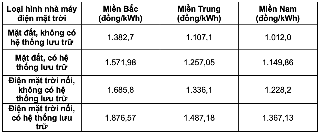 Đối với nhà máy điện mặt trời mặt đất có hệ thống pin tích trữ, mức giá tối đa (chưa bao gồm thuế giá trị gia tăng) cho khu vực miền Bắc là 1.571,98 đồng/kWh; miền Trung là 1.257,05 đồng/kWh; miền Nam là 1.149,86 đồng/kWh.