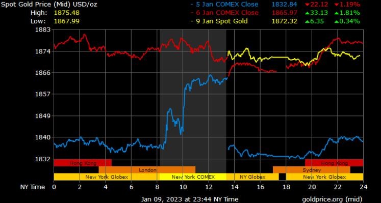 Giá vàng tương lai giao tháng 2/2023 trên sàn Comex New York tăng 8,1 USD lên 1.877,8 USD/ounce.