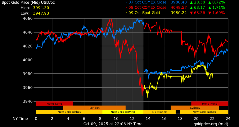 Giá vàng tương lai giao tháng 12/2025 trên sàn Comex New York giảm mạnh 97,9 USD, tương ứng giảm 2,41% xuống mức 3.972,6 USD/ounce.
