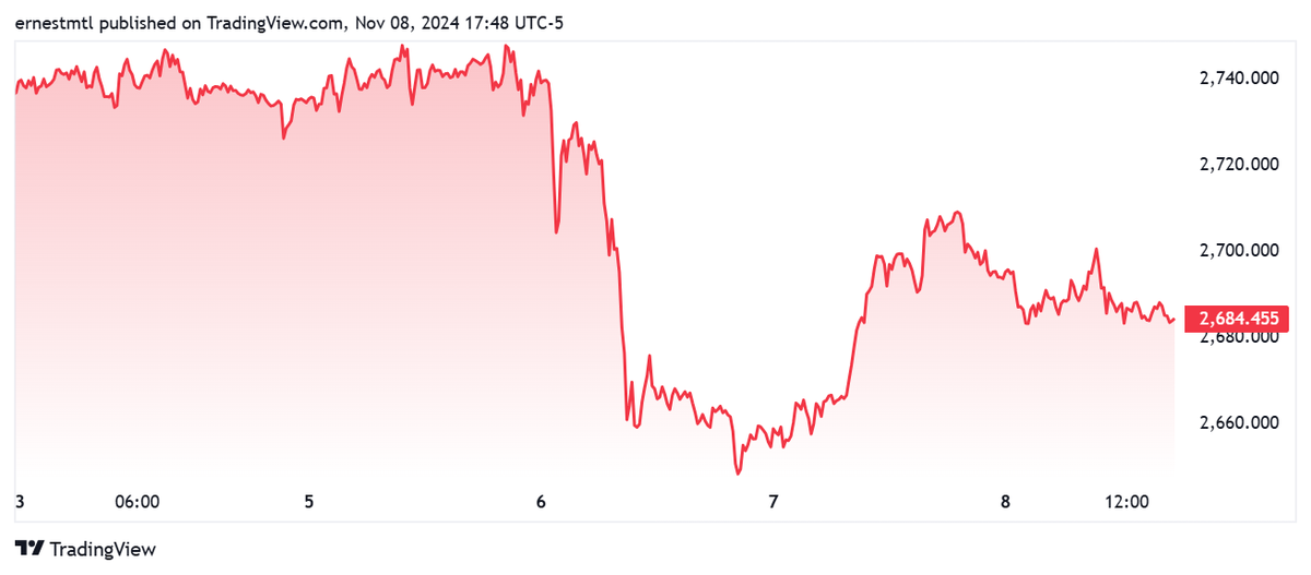 Trên thị trường vàng thế giới, giá vàng giao ngay chốt phiên hôm qua tại Mỹ giảm 22,4 USD xuống 2.683,7 USD/ounce.