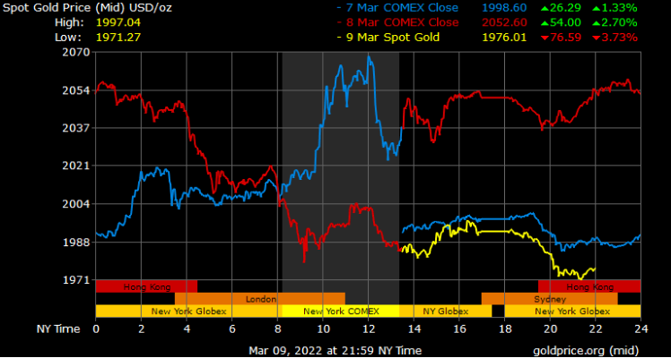 Trên thị trường vàng thế giới, giá vàng giao ngay chốt phiên ngày hôm qua tại Mỹ giảm mạnh 61,3 USD/ounce xuống 1.991,3 USD/ounce. Sang phiên châu Á sáng nay, giá vàng tiếp tục giảm xuống mức 1.976,2 USD/ounce.