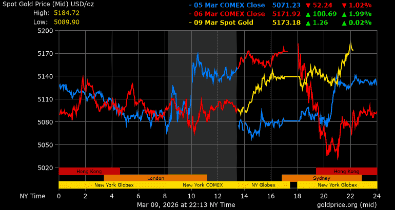 Trên thị trường vàng thế giới, giá vàng giao ngay chốt phiên hôm qua tại Mỹ giảm 33,6 USD, tương ứng giảm 0,65% xuống mức 5.137,9 USD/ounce. Sang phiên châu Á sáng nay, giá vàng đảo chiều tăng 34,8 USD lên mức 5.172,7 USD/ounce.