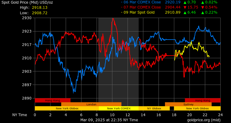 Trên thị trường vàng thế giới, giá vàng giao ngay chốt phiên cuối tuần qua tại Mỹ giảm 1,6 USD xuống mức 2.909,6 USD/ounce. Sang phiên châu Á sáng nay, giá vàng đảo chiều tăng nhẹ 2,2 USD lên 2.911,8 USD/ounce.