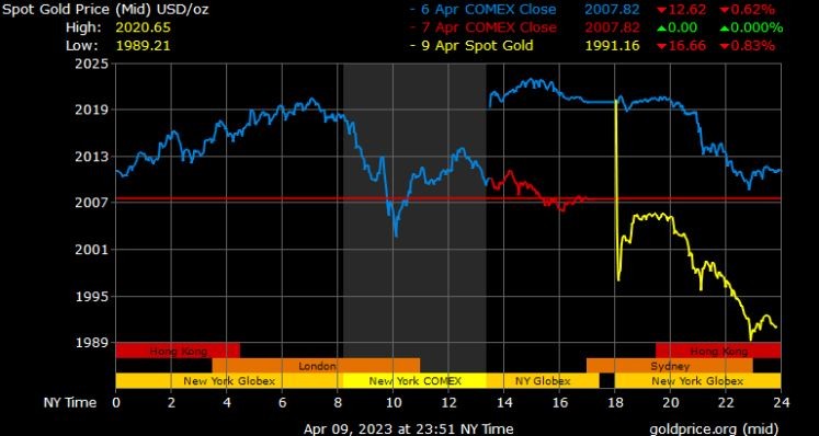 Giá vàng tương lai giao tháng 6/2023 trên sàn Comex New York giảm 9,2 USD, tương ứng giảm 0,45% xuống 2.026,4 USD/ounce.