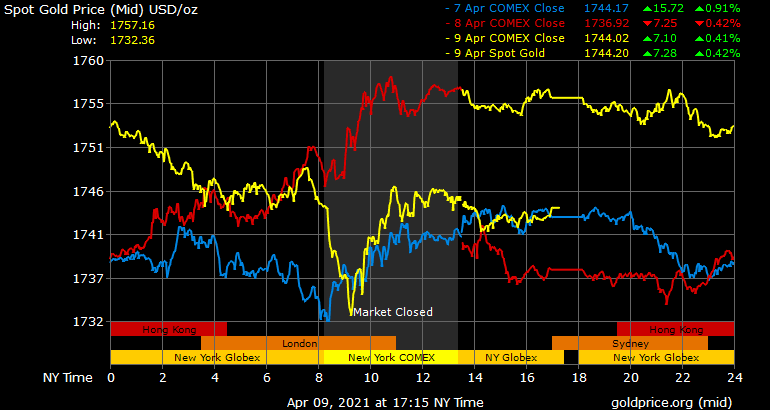 Trên thị trường vàng thế giới, giá vàng giao ngay chốt phiên đêm qua tại Mỹ giảm 11,6 USD xuống 1.744,2 USD/ounce. Giá vàng tương lai giao tháng 5 trên sàn Comex New York giảm 14,9 USD xuống 1.742,2 USD/ounce.
