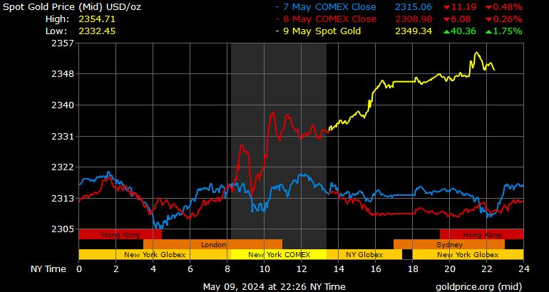 Trên thị trường vàng thế giới, giá vàng giao ngay chốt phiên hôm qua tại Mỹ tăng 37,6 USD lên 2.346,2 USD/ounce. Sang phiên châu Á sáng nay, giá vàng tiếp tục tăng nhẹ 3,2 USD lên 2.349,4 USD/ounce.