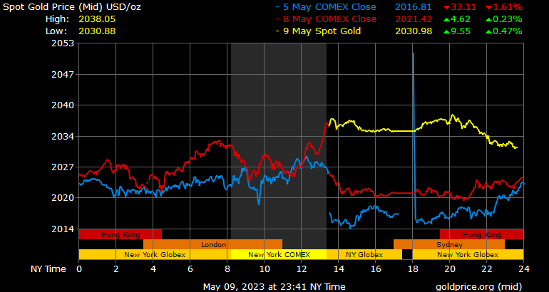 Giá vàng tương lai giao tháng 6/2023 trên sàn Comex New York tăng 9,7 USD, tương ứng tăng 0,48% lên 2.042,9 USD/ounce.