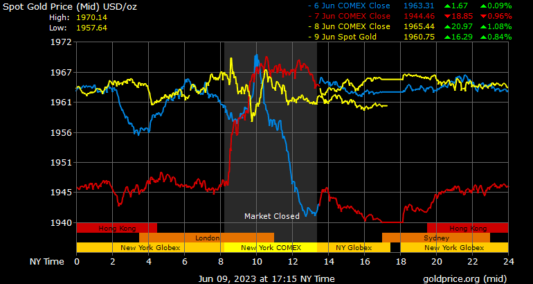 Trên thị trường vàng thế giới, giá vàng giao ngay chốt phiên cuối tuần tại Mỹ giảm 3,9 USD xuống 1.960,7 USD/ounce.