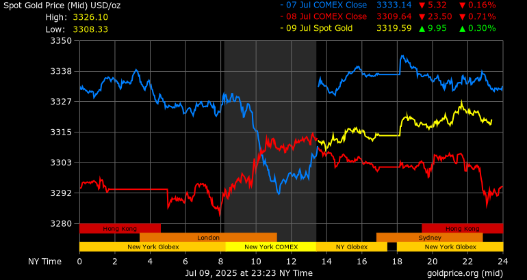 Giá vàng tương lai giao tháng 8/2025 trên sàn Comex New York tăng 4,1 USD, tương ứng tăng 0,12% lên mức 3.321 USD/ounce.