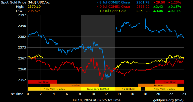 Giá vàng tương lai giao tháng 8/2024 trên sàn Comex New York tăng 4,4 USD, tương ứng tăng 0,19% lên mức 2.367,9 USD/ounce.