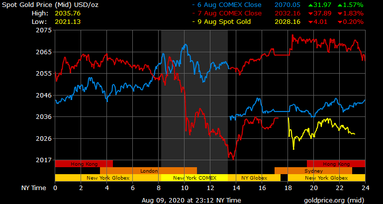 Giá vàng thế giới phiên ngày thứ Sáu đã giảm khá mạnh do áp lực chốt lời gia tăng. Trong tuần qua, giá vàng thế giới đã có lần đầu tiên chạm mốc 2.000 USD/ounce, sau đó tiến lên 2.050 USD/ounce, và có thời điểm đã thiết lập mức kỷ lục mới tại mốc 2.089,2 USD/ounce.