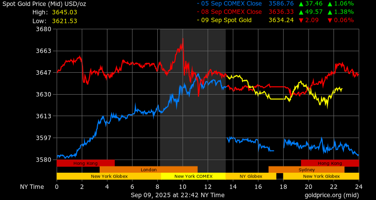 Trên thị trường vàng thế giới, giá vàng giao ngay chốt phiên hôm qua tại Mỹ giảm 9,5 USD xuống mức 3.626,3 USD/ounce. Sang phiên châu Á sáng nay, giá vàng đảo chiều tăng nhẹ 7,6 USD lên 3.633,9 USD/ounce.