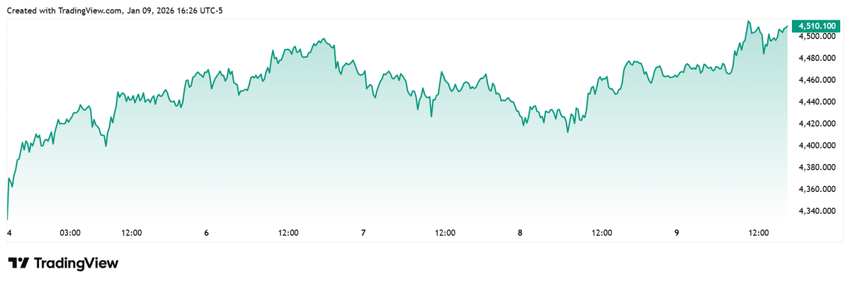 (ĐTCK) Vàng đã có tuần giao dịch đầu năm 2026 đầy ấn tượng với mức tăng gần 4%, lên mức 4.500 USD/ounce và giới phân tích vẫn lạc quan về triển vọng khi cho rằng "chưa thấy bằng chứng nào cho thấy đợt tăng giá hiện tại đã kết thúc".